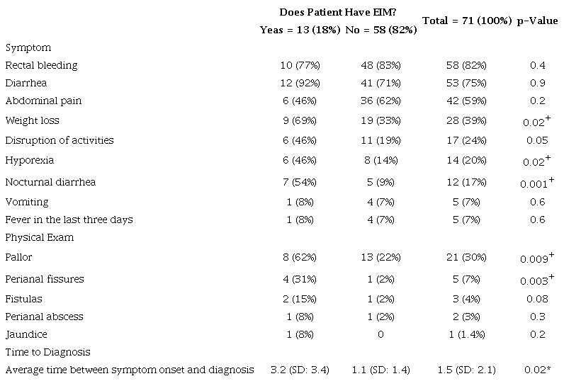 Results: Of 71 confirmed cases, 45% had typical ulcerative colitis, 27% Crohn’s disease, 7% atypical ulcerative colitis, 1.4% colonic Crohn’s, and 20% unclassifiable IBD. Thirteen patients (18%) had at least one EIM, and mucocutaneous was the most frequent (58%). The time from symptoms onset to diagnosis was higher in the EIM group (13.2 years vs. 10.2 years; p = 0.02). Nocturnal diarrhea, hyporexia, and weight loss were more frequent in children with EIM. The EIM group showed lower hemoglobin levels, and higher globular sedimentation rate, and received biologics more frequently (38% vs. 23%, p = 0.2).