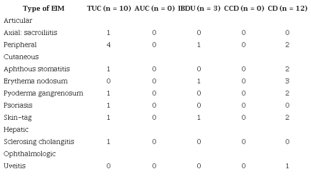 Although the intestine is the primary target, other organs can be affected. In adults, 50% develop at least one extraintestinal manifestation (EIM) during the course of the disease, and EIMs can precede intestinal symptoms in 16% to 25% of cases6-9. In Colombia, a prevalence of 23.3% has been reported in adults, with joint involvement being the most frequent, as noted in other series6,10. Most EIMs occur in parallel with bowel disease activity and are more common in CD, especially in CCD patients11,12.