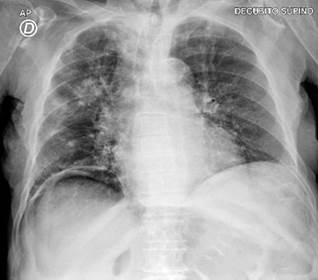 The complete blood count showed no leukocytosis or neutrophilia, mild anemia, normal renal function and arterial blood gases, hyponatremia of 128 mmol/L, and mildly elevated C-reactive protein at 5.4 mg/dL. The urinalysis suggested infection, with subsequent growth of Enterococcus faecalis in the urine culture. The chest X-ray (Figure 1) revealed diffuse thickening of the central and peripheral interstitium, predominantly on the right side, with patchy areas of ground-glass opacity superimposed on an interstitial pattern, as well as pneumoperitoneum. The uro-CT (Figure 2) showed thickening of the bladder walls without other findings in the urinary tract, and evidence of pneumoperitoneum without identifiable lesions, free fluid, or inflammatory processes.