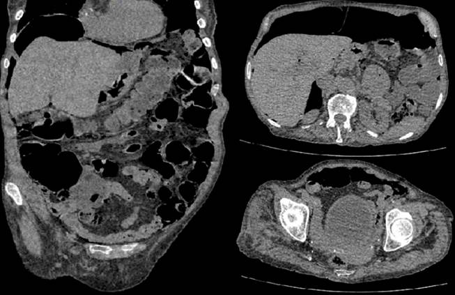 The patient, bedridden, was assessed using the Barthel index, which scored 40/100. She experienced coughing fits, was asymptomatic gastrointestinally, had a distended and soft abdomen without pain, and showed no signs of peritoneal irritation. However, due to the pneumoperitoneum found in the uro-CT, an abdominal CT with double contrast was requested (Figure 3). This scan revealed bladder wall thickening related to her urinary tract infection, significant pneumoperitoneum, no inflammatory processes or free fluid, and air bubbles in the intestinal walls compatible with pneumatosis cystoides intestinalis. These findings were not present in a contrast-enhanced abdominal CT performed seven months earlier during an acute diarrheal disease study.