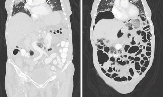 One of these patients presents findings related to pneumatosis cystoides intestinalis, which recently developed alongside the noted symptoms, as it was not documented in previous CT studies during earlier hospitalizations. Pneumatosis cystoides intestinalis is a rare condition first described by Du Vernoy in autopsies in 1730 and later named by Mayers in 18258. It is defined as the presence of air dissecting the intestinal wall9 and can be divided into two types: primary (15%) and secondary (85%)10. Its severity can range from a benign condition to one that is life-threatening9.