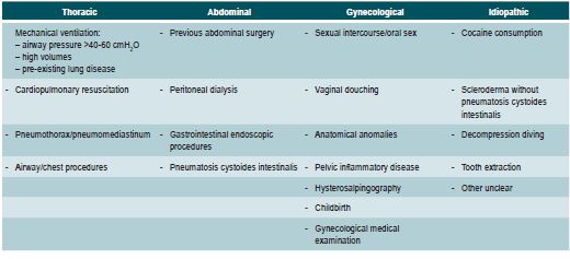 According to Mularski and colleagues, non-surgical pneumoperitoneum can be classified into five categories based on its origin: thoracic (43.4%), abdominal (30.6%), gynecological (7.6%), and idiopathic (18.4%) (Table 1)5.