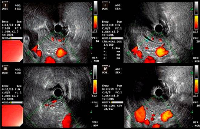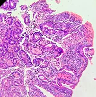 Based on the clinical and laboratory findings, celiac disease (CD) was suspected. Additional studies were conducted, including a duodenal biopsy following the protocol for CD, which reported findings consistent with Marsh 1 (Figure 1) and Marsh 2 (Figure 2) classifications, and an endoscopic ultrasound showing findings consistent with chronic pancreatitis (Figure 3). After discharge, the patient had positive anti-tissue transglutaminase IgA antibody results and normal IgA levels.