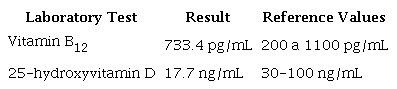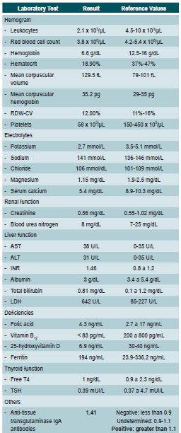 Laboratory tests revealed macrocytic hyperchromic anemia, leukopenia, thrombocytopenia, normal renal function, hypokalemia, hypocalcemia, hypomagnesemia, prolonged international normalized ratio (INR), and deficiencies in vitamins B12 and D (Table 1). Intravenous electrolyte replacement was administered, and additional studies were conducted. Endoscopic studies of the upper and lower digestive tracts, tumor markers, and thoracic and abdominal CT scans were unremarkable.