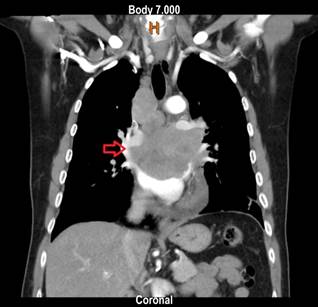 A 58-year-old male patient initially presented in August 2021 with an episode of hemoptysis, constitutional symptoms, progressive dyspnea, and decreased functional status. A contrast-enhanced computed tomography (CT) scan of the chest and abdomen revealed a large mediastinal mass infiltrating and compressing the esophagus, vascular, and bronchial structures, with no evident abdominal infiltration (Figures 1 and 2). A biopsy confirmed a small cell lung neuroendocrine carcinoma through immunohistochemistry. Staging studies at that time were negative for metastatic lesions, making the patient a candidate for chemotherapy and radiotherapy. He completed three cycles of chemotherapy with cisplatin and etoposide, along with 23 sessions of consolidative radiotherapy to the mediastinum, between December 2021 and March 2022, achieving an adequate response at that time.