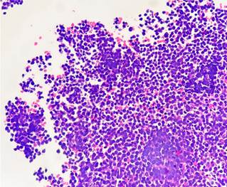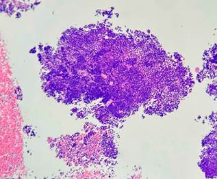 A biopsy was performed using endoscopic ultrasound guidance, employing a transgastric approach with a modified wet suction technique and a 19G needle. The sample obtained was analyzed for cytopathology and histopathology, leading to a final diagnosis of a high-grade malignant tumor with small round cell morphology (Figures 7 and 8). The patient received an additional dose of chemotherapy in the emergency department, which resulted in an unfavorable clinical outcome and a decline to NYHA functional class III/IV. As a result, it was ultimately determined that the patient was a candidate for a home palliative care package.