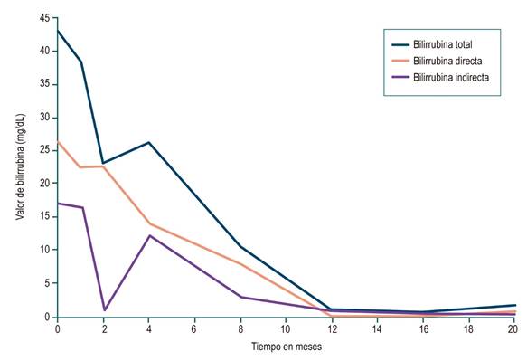 Given the clinical presentation and absence of cirrhosis, a diagnosis of benign recurrent intrahepatic cholestasis (BRIC) was established. The patient received symptomatic treatment for pruritus with topical betamethasone and loratadine, as well as ursodeoxycholic acid at a dose of 1,200 mg/day. At a follow-up 20 months later, marked reduction in bilirubin levels was observed (Figure 1), along with normalization of other liver function tests.