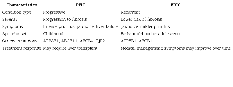 BRIC typically manifests at later ages (in contrast to PFIC, which begins in childhood), presents with recurrent jaundice episodes, and follows a benign course without fibrosis; however, there is a risk of progression to PFIC. Table 2 provides a comparative overview of these two conditions. In this case, liver biopsy showed no fibrosis but did reveal severe, predominantly intracanalicular cholestasis with mild portal inflammation, characteristic of BRIC13.