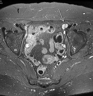 In June 2021, the patient consulted the emergency department due to inflammatory changes in the lower limbs and bilateral edema. A magnetic resonance imaging was conducted, which reported a solid tubular-shaped lesion with lobulated contours, measuring 75 mm in its largest diameter, with intermediate signal in T2-weighted sequences, exhibiting restriction in diffusion-weighted sequences and heterogeneous enhancement post-contrast. This lesion was located adjacent to the right ischiopubic ramus and was associated with adenopathies containing heterogeneous material, likely necrotic, in the right inguinal region (25 mm in diameter). Additionally, she had a known neoplastic lesion in the left retroperitoneum, with significant fibrotic changes and proximal urethral prominence.