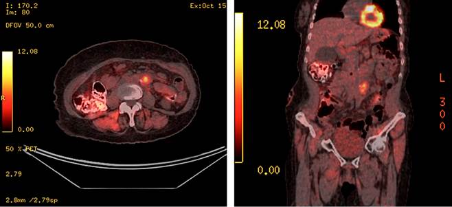 In October 2020, a re-evaluation was conducted using a positron emission tomography-computed tomography (PET-CT), which revealed an increase in the density of the left paraaortic retroperitoneal fat, with a hypermetabolic image approximately 15 mm in size and a maximum standardized uptake value (SUV) of 7.32, related to surgical sutures, near the inferior mesenteric vessels, likely tumor-related, with no other pathological findings (Figure 2).