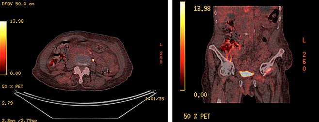 In October 2020, a re-evaluation was conducted using a positron emission tomography-computed tomography (PET-CT), which revealed an increase in the density of the left paraaortic retroperitoneal fat, with a hypermetabolic image approximately 15 mm in size and a maximum standardized uptake value (SUV) of 7.32, related to surgical sutures, near the inferior mesenteric vessels, likely tumor-related, with no other pathological findings (Figure 2).