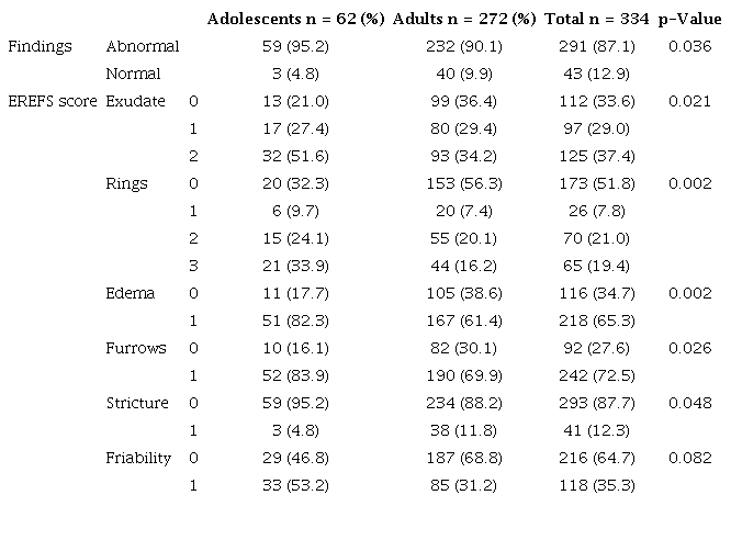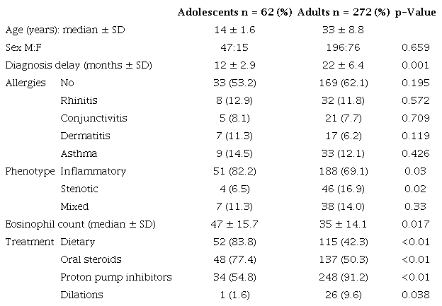 Resultados: De los 334 pacientes, 272 eran adultos (81,4%) y 62 adolescentes (18,6%). No se encontraron diferencias significativas en cuanto a la distribución por sexo o síntomas alérgicos. Sin embargo, los adultos presentaron un mayor retraso en el diagnóstico (22 meses frente a 12 meses, p = 0,001) y un fenotipo de estenosis más frecuente (16,9% frente a 6,5%, p = 0,02). Los adolescentes, en cambio, mostraron mayor frecuencia de hallazgos endoscópicos de EEo (EREFS: 95,2% frente a 90,1%; p = 0,036) y un recuento de eosinófilos superior (47 frente a 35 Eo/CAP [campo de alto poder], p = 0,017). Las estrategias terapéuticas también variaron: los adolescentes fueron tratados principalmente con restricciones dietéticas y corticosteroides tópicos, mientras que los adultos recibieron inhibidores de la bomba de protones.