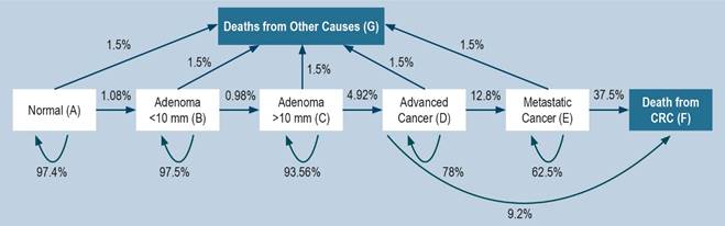 The proposed model defines the transition probabilities for each stage, as presented in the transition probability matrix, which reflects the natural history of CRC.