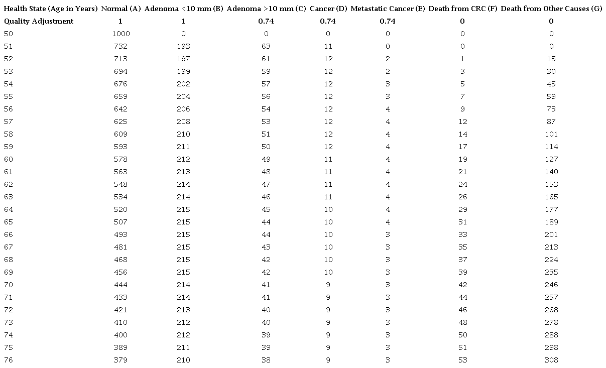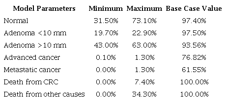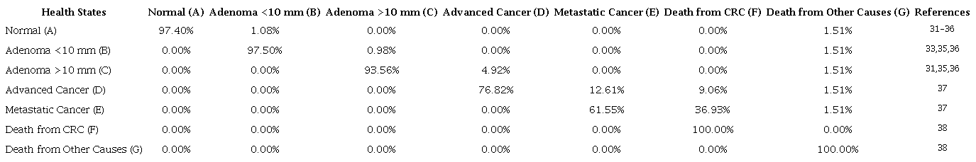 The literature indicates that a patient undergoing a screening colonoscopy with normal results has a 97% probability of remaining in this normal stage for one year and a 1% probability of progressing to an adenoma smaller than 10 mm31,32,34-38. A person with an adenoma smaller than 10 mm has a 97% probability of remaining in the same stage for one year and a 1% probability of progressing to an adenoma larger than 10 mm35,37,38. A patient with an adenoma larger than 10 mm has a 5% probability of progressing to advanced regional cancer within one year and a 94% probability of remaining in the same stage34,36-38. A patient with advanced regional cancer identified during a screening colonoscopy has a 77% probability of remaining in this stage for one year, a 13% probability of progressing to metastatic cancer, and a 9% probability of progressing to death from CRC within one year39. A patient diagnosed with metastatic CRC during screening has a 62% probability of surviving for one year and a 37% probability of progressing to death within that time39 (Table 7).