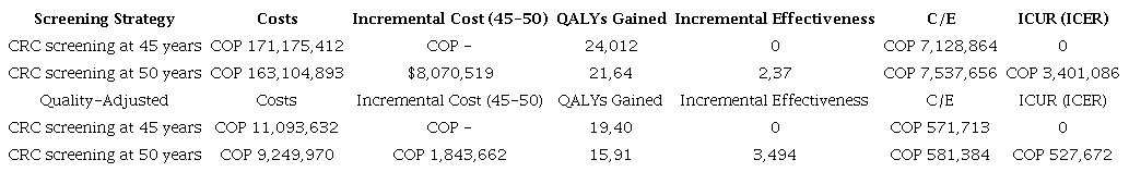 Methods: A Markov model simulating the natural history of CRC was used to compare the initiation of screening at ages 45 and 50. The cost-utility analysis incorporated costs and utilized Colombia’s per capita gross domestic product (GDP) threshold (COP 21,500,000).