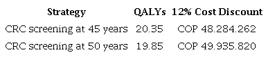 Resultados: Iniciar la tamización de la colonoscopia a los 45 años fue 0,33% menos costosa, produjo una ganancia de 3,49 años de vida ajustados por calidad (AVAC) y una proporción de mortalidad 37% menor que si se inicia a los 50 años (costos: COP 92.364.407 frente a COP 92.669.231, AVAC: 19,40 frente a 15,91, y proporción de mortalidad: 3,4% frente a 5,4%, respectivamente).