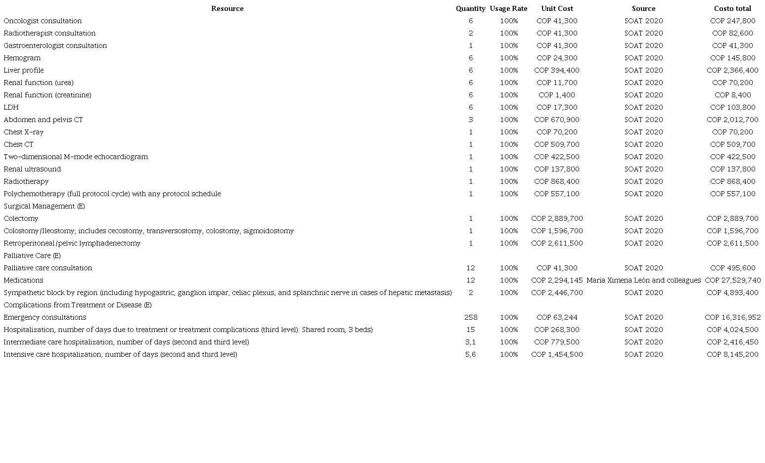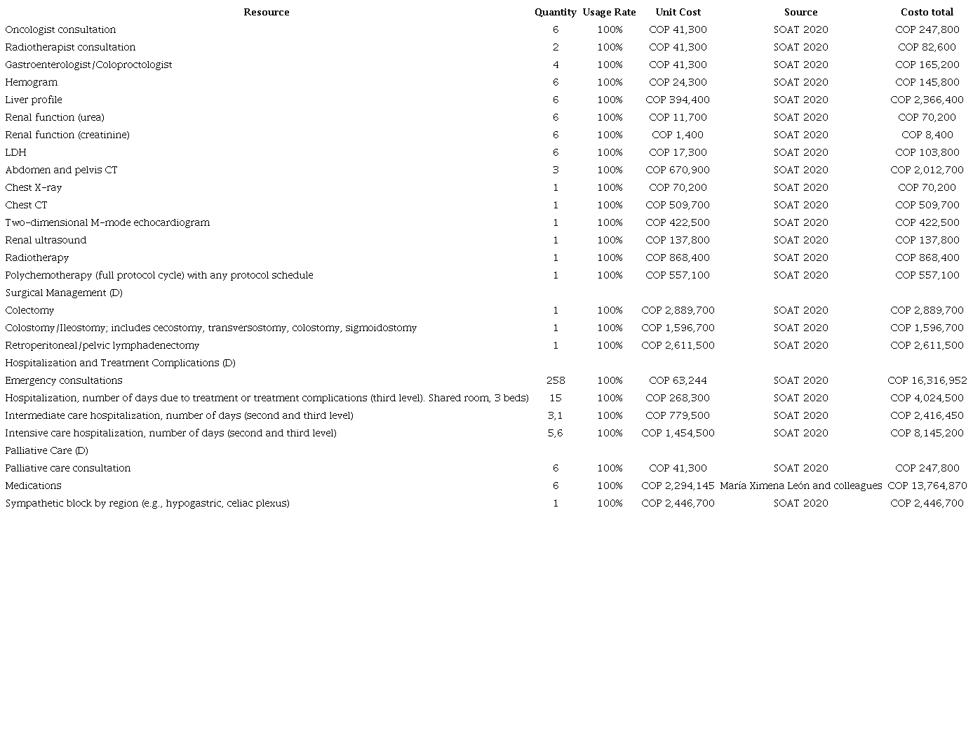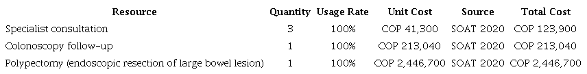 To estimate costs, the Medication Price Information System (SISMED in Spanish) database was consulted to determine weighted averages and reported unit quantities. Micro-costing was conducted, and monetary valuation was calculated using the official fee manual of Colombia’s mandatory traffic accident insurance (SOAT in Spanish). Direct costs for each stage were considered, including procedural costs and treatment costs for complications (Tables 1-5).