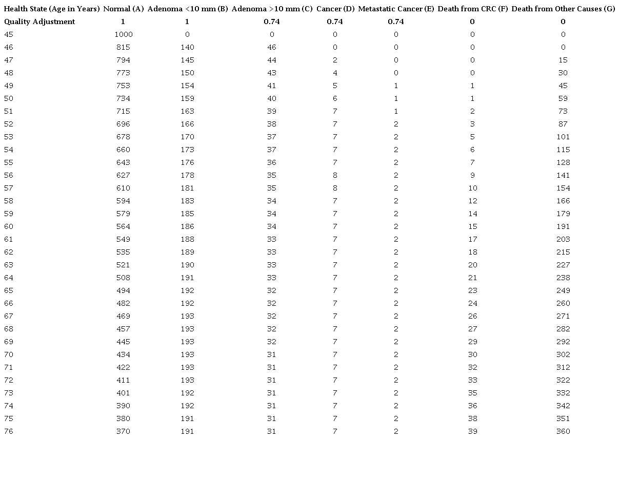 Using the parameters described above (Table 8), a transition matrix was constructed for a cohort of 1,000 patients. This included 31 cycles for patients starting screening at age 45 and 26 cycles for those starting at age 50 (Tables 9 and 10).