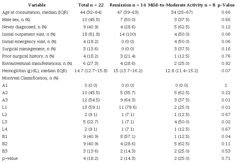 A total of 22 patients were included in this case series. The median age was 44 years (IQR: 32-64), 10 (45%) were male, 9 (41%) were newly diagnosed, 14 (63.4%) were in remission, and 8 (36.6%) had mild-to-moderate activity (MMA) at the initial evaluation. Ileocolonic involvement (Montreal classification L3) was more frequent among patients with MMA compared to those in remission (50% versus 7%, p < 0.05). Conversely, classifications A3, L1, and B1 were more common in patients in remission at the initial evaluation (A3: 64% versus 37%, p < 0.05; L1: 79% versus 25%, p < 0.05; and B1: 57% versus 12%, p < 0.05) (Table 2).