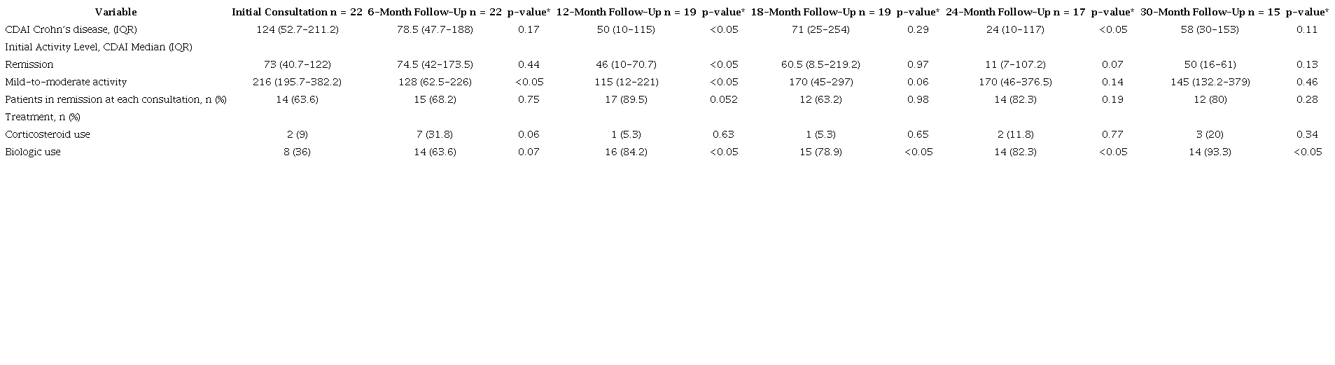 Results: A total of 22 patients were included, with a median age of 44 years (interquartile range [IQR]: 32-64); 10 (45%) were men. At enrollment, 14 patients (63.4%) were in remission, while 8 (36.6%) had mild to moderate disease activity. The median CDAI at enrollment was 124 (IQR: 52.7-211.2), with a significant reduction observed at 12 months (CDAI: 50, IQR: 10-115) and 24 months (CDAI: 24, IQR: 10-117) (p < 0.05). At the end of the follow-up period, 12 patients (80%) were in remission, 3 (20%) had mild to moderate disease activity, 7 (31.8%) were lost to follow-up at two years, and 14 (93.3%) were on biologic therapy.