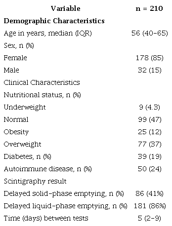 During the study period, a total of 1,217 gastric emptying scintigraphies were performed across the three centers. After excluding patients under 18 years of age or those who had undergone only one phase of the test, 242 eligible patients were identified. Of these, 32 met at least one exclusion criterion, resulting in a total of 210 patients included in the analysis. The sociodemographic and clinical characteristics of the included patients are summarized in Table 3. The median age was 56 years (interquartile range [IQR]: 40-65), and 85% of the study population was female. Normal nutritional status, as defined by body mass index, accounted for 47% of the population. Diabetes was present in 19% of patients, and 24% had a history of autoimmune disease. Regarding the gastric emptying results, 41% of patients showed delayed solid-phase gastric emptying, while 86% showed delayed liquid-phase gastric emptying. Concordance between the two phases was observed in 101 patients (48.1%), while 109 patients (51.9%) showed discordant results.