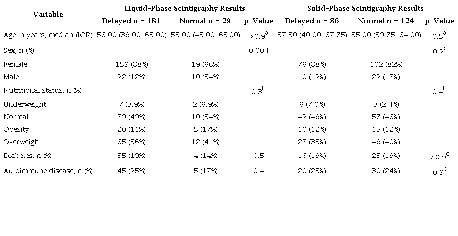 Table 4 shows that being female was associated with delayed gastric emptying scintigraphy results for liquids (p = 0.004). No other variables showed significant differences.