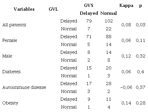 Resultados: 210 pacientes cumplieron los criterios de inclusión, 86 pacientes (41%) tuvieron un resultado retardado en la fase de sólidos y 181 (86%) en la fase de líquidos. El valor de κ fue de 0,082 (intervalo de confianza del 95 % [IC 95%]: 0,005 a 0,16) con resultados estadísticamente significativos (p < 0,05). El principal patrón de divergencia entre los resultados fue el vaciamiento para sólidos normal con líquidos retardado en 102 pacientes (48,6%).