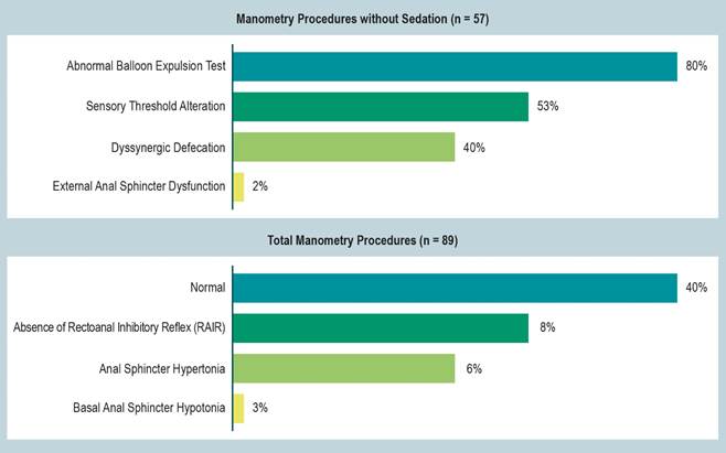 Of the total manometry procedures performed, 60% were abnormal. Among these, 8% lacked a rectoanal inhibitory reflex (RAIR), 6% exhibited anal sphincter hypertonia, and 3% had anal sphincter hypotonia. Among the 57 manometry procedures conducted without sedation, the diagnoses included abnormal balloon expulsion test (BET) in 80%, sensory threshold alteration in 53%, dyssynergic defecation in 40%, and external anal sphincter dysfunction in 2% (Figure 1).