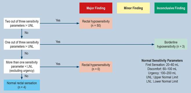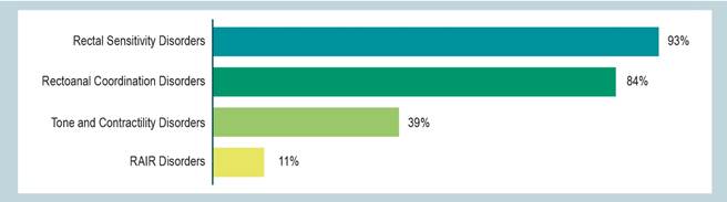 Results: A total of 89 patients were evaluated. According to the conventional classification, 60% of the patients had abnormalities on manometry, and 8% lacked a rectoanal inhibitory reflex (RAIR). HRAM without sedation was performed in 57 patients, of whom 80% showed an abnormal balloon expulsion test (BET); 53% had alterations in sensory thresholds, and 40% exhibited dyssynergic defecation. When extrapolated to the London classification, 93% were found to have rectal sensory disorders; 84% had rectoanal coordination disorders; 39% presented tone and contractility disorders, and 11% had rectoanal areflexia.