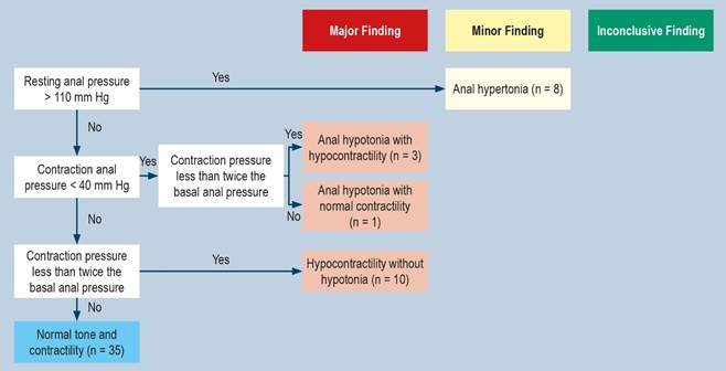 Conclusiones: Los trastornos anorrectales son frecuentes en el estreñimiento crónico refractario en niños, y se diagnostican mediante MAR-AR para establecer pronósticos y tratamientos dirigidos, como en el caso de las disinergias. Una clasificación similar a la de Londres con valores manométricos establecidos para la población pediátrica por grupos de edades permitiría un enfoque sistemático y complementario al enfoque tradicional y aumentaría la sensibilidad diagnóstica.