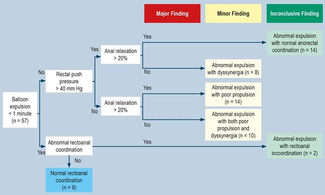 The London Classification, currently applied in adults, organizes HRARM interpretation by grouping disorders of tone, contractility, coordination, sensitivity, and RAIR. For pediatric populations, it is proposed that these five groups of parameters be evaluated according to age groups. Some disorders, such as RAIR, can be assessed at all ages, while others, like tone, require an alert state, and parameters like contraction, coordination, and sensitivity require a certain level of neurocognitive development to follow instructions. When extrapolating this classification to the pediatric population, 84.2% of patients had a rectoanal coordination disorder, with abnormal expulsion accompanied by dyssynergia and poor propulsion being the most common findings. Pelvic floor dyssynergia diagnosis requires confirmatory studies, such as defecography, but it can be suspected in patients with an abnormal BET. In this study, the adult parameter for balloon expulsion time (<1 minute) was applied. However, there is no consensus regarding abnormal balloon expulsion time in the pediatric population. It is likely that balloon expulsion time varies across age groups due to differences in central nervous system maturity.