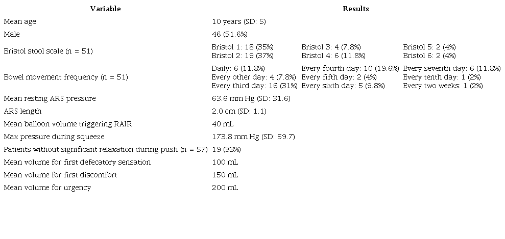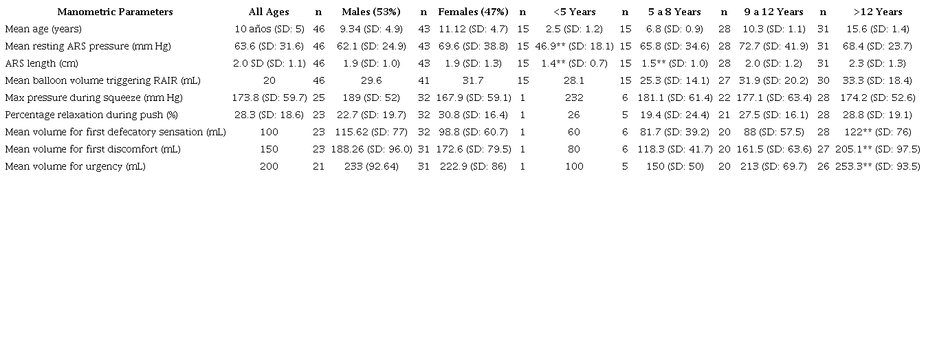 The absence of standardized values in children complicates the comprehensive understanding of anorectal physiology. Establishing reference values in a healthy pediatric population stratified by age groups remains a significant challenge. Further studies in pediatric digestive physiology are necessary to establish normative values and classify them by age groups in Latin American populations.