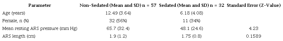 In 32 patients, manometry was performed under sedation, assessing RAIR presence and resting anal sphincter pressure. These patients demonstrated a 25% lower resting anal sphincter pressure compared to non-sedated patients, with no significant differences in anal sphincter length (Table 3).