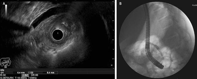 Laboratory tests performed at the referring institution revealed marked leukocytosis (16,280 cells/μL) with neutrophilia (80%), a negative pregnancy test, and, notably, normal bilirubin and alkaline phosphatase levels. As part of the abdominal pain workup, a complete abdominal ultrasound was performed at the referring site, which identified cholelithiasis without signs of cholecystitis and multiple diffuse focal lesions predominantly affecting the right hepatic lobe. To better characterize these findings, a contrast-enhanced magnetic resonance imaging (MRI) of the abdomen was conducted, revealing hypointense areas with geographic contours, primarily in the right hepatic lobe. At our institution, laboratory tests showed alterations in liver biochemistry consistent with a cholestatic pattern (total bilirubin: 4.59 mg/dL, direct bilirubin: 3.38 mg/dL, alkaline phosphatase: 279 U/L, aspartate aminotransferase [AST]: 976 U/L, alanine aminotransferase [ALT]: 1,553 U/L). Tests for hepatotropic viruses were negative, and coagulation times, renal function, and electrolyte levels were within normal limits. Given the persistence of abdominal pain, the cholestatic biochemical pattern, and focal liver lesions, choledocholithiasis was deemed highly probable despite its absence in prior imaging studies. Consequently, endoscopic ultrasound (EUS) was performed, which revealed hyperechoic lesions consistent with microabscesses in the right hepatic lobe and dilation of the distal common bile duct (CBD) to 9 mm, with a 6 mm hyperechoic image in its distal third suggestive of biliary lithiasis. During the same anesthetic session, an ERCP was performed without rectal administration of nonsteroidal anti-inflammatory drugs (NSAIDs). Purulent fluid was observed, and the CBD measured 6 mm in diameter. A 5 mm stone was successfully extracted. As adequate clearance of the contrast medium was not achieved, a plastic biliary stent was placed without complications (Figure 1). In light of cholangitis, antibiotic therapy with intravenous piperacillin/tazobactam 4.5 mg every six hours was initiated.