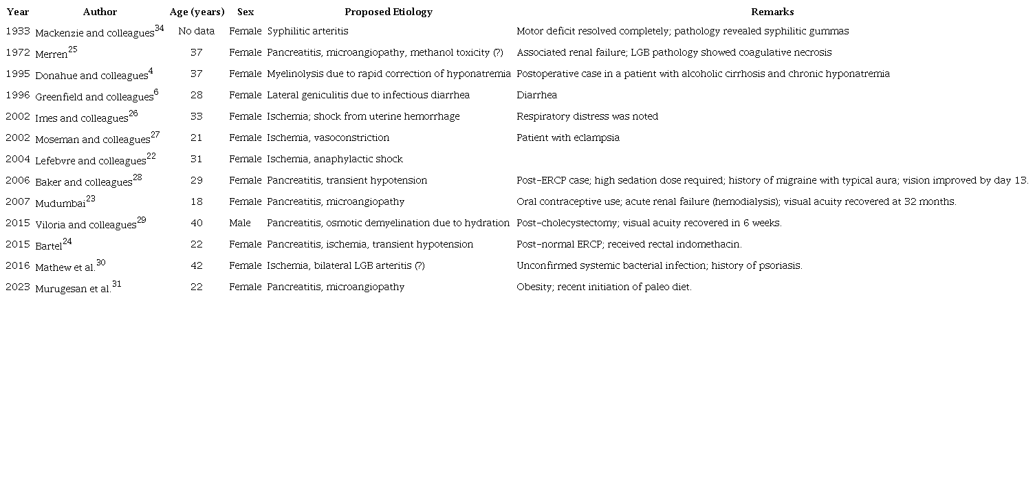 As presented in this case, bilateral lesions of the lateral geniculate bodies (LGBs) have been infrequently described in the literature (Table 1), and the underlying mechanisms for their involvement remain poorly understood. The first known report was published in 1933 by MacKenzie and colleagues, who described these lesions in the context of anterior choroidal arteritis secondary to syphilis22. Since then, various mechanisms have been proposed to explain such injuries. Among these are hypoperfusion and ischemia resulting from hemodynamic changes secondary to massive hemorrhage or anaphylactic shock, as the LGBs lie in a vascular border zone supplied by the anterior, middle, and posterior arterial territories22. Other proposed mechanisms include posterior circulation cerebral infarcts in patients with microangiopathic hemolytic anemia, traumatic brain injury, and methanol-induced cytotoxicity (pancreatitis and renal necrosis). Due to the histological similarity between the LGBs and the brainstem pons, it has been hypothesized that the tightly interwoven neuronal and oligodendroglial networks in the LGBs hinder cellular expansion during rapid sodium level increases, resulting in bilateral extrapontine geniculate myelinolysis due to overly rapid correction of hyponatremia23. Additional etiologies reported include aseptic lateral geniculitis, H1N1 influenza, severe preeclampsia, inflammatory bowel disease, and anaphylactic shock24.