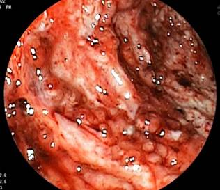 A total colonoscopy was performed (Figure 1), which revealed multiple mucosal ulcerations with necrosis, clots, and patchy ulcerations in the rectum, descending colon, and transverse colon, with diffuse bleeding that could not be controlled endoscopically. Following the procedure, the patient experienced significant rectal bleeding, prompting an abdominal CT angiography, which showed irregular, concentric mural thickening of the cecum and ascending colon without evidence of contrast extravasation. Due to the persistence of bleeding and a hemoglobin drop to 6.9 g/dL, an abdominal aortogram was performed. At the level of the right hypogastric artery, contrast extravasation was observed in the distal branch, leading to endovascular embolization of the affected vessel. Initial differential diagnoses included severe ulcerative colitis and ischemic colitis, which were rapidly ruled out based on the clinical presentation and the absence of relevant medical history or risk factors.