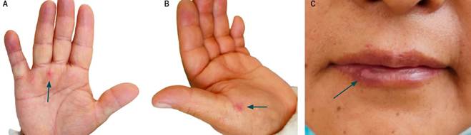 On physical examination, erythematous skin lesions were observed on the palms, anterior chest, and face (Figure 1), which were confirmed as hemangiomas by biopsy. Additionally, there was a residual pyogenic granuloma lesion on the lower lip that disappeared upon digital pressure and was associated with mild tenderness on palpation. The patient displayed a complete absence of axillary and pubic hair.