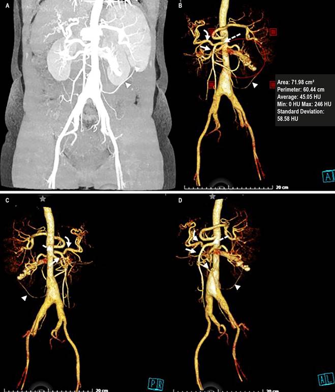 In this case, splenorenal collaterals, an aneurysm of the inferior segmental artery of the left kidney, and a shunt connecting the splenic and superior mesenteric veins to the inferior vena cava were identified. Therefore, other arteriovenous malformations must also be detected, similar to the case reported by Păcurar and colleagues21, which involved type Ib Abernethy malformation with a hepatic artery originating from the superior mesenteric artery, hepatic veins forming a short common trunk before draining into the inferior vena cava, and a supernumerary right renal artery arising from the aorta.