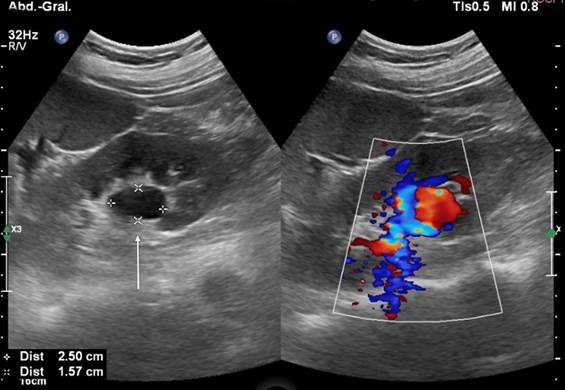 An abdominal ultrasound revealed hepatomegaly with a slightly heterogeneous size, increased echogenicity, and splenomegaly measuring 15 x 6.4 cm. A subsequent 3D reconstruction abdominal angiography (Figure 2) showed that the proximal third of the portal vein measured approximately 8.6 mm, with hypoplasia of the portal hilum and its branches. Multiple shunts were observed connecting the splenic and superior mesenteric veins to the inferior vena cava, along with a splenorenal shunt measuring approximately 10 mm. Additionally, tortuous collateral veins extended to the short gastric and splenorenal veins. The liver displayed parenchymal density changes and Glisson’s capsule irregularities consistent with chronic liver disease, as well as dilated venous vessels at the lower pole of the left kidney. Based on these findings, Abernethy malformation was diagnosed as an incidental finding via computed tomography, and a lower segmental renal artery aneurysm was identified through Doppler color ultrasound (Figure 3).