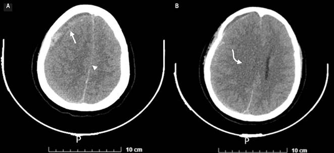 The patient experienced one episode of syncope and was later hospitalized due to a chronic subdural hematoma and subarachnoid hemorrhage, as evidenced by cranial computed tomography (Figure 4). She subsequently developed respiratory decompensation and was admitted to the intensive care unit due to bacterial hospital-acquired pneumonia. Later, a pleural effusion was detected, necessitating chest tube drainage, after which she remained hospitalized until stabilization.