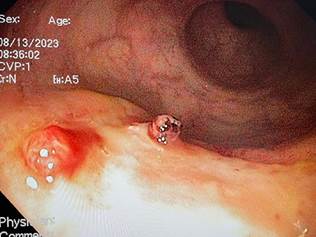 After 48 hours, upper gastrointestinal endoscopy and colonoscopy were performed. The endoscopy showed Forrest IIB and III gastric ulcers that required adrenaline sclerotherapy, as well as erosive duodenitis. The colonoscopy revealed grade IV internal hemorrhoids, a thrombectomy scar on the right anterior hemorrhoidal site, and an actively bleeding Dieulafoy’s lesion (Figure 1). A hemostatic clip was applied to the base of the vessel to prevent further bleeding (Figure 2).
