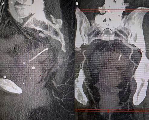 Laboratory tests revealed hypocalcemia, elevated nitrogenous waste levels, hypoglycemia, moderate hypokalemia, and arterial blood gases indicative of metabolic acidosis. Radiographic and contrast-enhanced abdominal and pelvic CT scans showed signs of hollow intestinal loop rupture, free fluid, and inflammatory changes in the peritoneum. Additionally, the imaging revealed a linear hyperdense structure in the left adnexal region and sigmoid colon, along with a right cortical renal cyst and cholelithiasis (Figure 1).