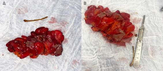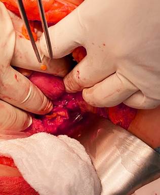 The patient was evaluated by the surgical team, who decided to perform an urgent exploratory laparotomy. Intraoperatively, diffuse peritonitis involving all four abdominal quadrants was observed (with 1600 mL of purulent fluid), as well as evidence of rectal perforation caused by a foreign body (a chicken bone) (Figure 2). A partial colectomy and colostomy were performed, and the foreign body was removed (Figure 3). Postoperatively, the patient required intensive care unit (ICU) monitoring and was administered a broad-spectrum antibiotic regimen for one week.