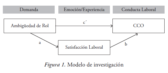 Por último, Bettencourt y Brown (2003) y Paillé (2011) han confirmado el efecto mediador de la satisfacción laboral en la relación entre la ambigüedad de rol y algunas dimensiones de CCO en diferentes muestras ocupacionales. Los autores afirmaron que el efecto negativo y perjudicial de la ambigüedad de rol sobre la realización de determinadas CCO sse se produce a través de la reducción de la satisfacción del empleado. De este modo, siguiendo la sugerencia de Podsakoff et al. (2000) nos parece interesante para detectar si dicha ese papel mediador de la satisfacción laboral se produce en el contexto de la administración pública. Asimismo, las evidencias empíricas citadas coinciden con el planteamiento teórico del modelo HERO (Salanova et al., 2012) donde indicadores del bienestar del empleado, como la satisfacción laboral, pueden servir de amortiguadores de los efectos negativos de la ambigüedad de rol sobre un resultado organizacional saludable, representados por la CCO. Por cuanto antecede, se formula la siguiente hipótesis:
