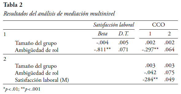 El método utilizado para el análisis de mediación multinivel sigue las recomendaciones de Zhang et al. (2009) y Baron y Kenny (1986). En primer lugar, se comprobó la hipótesis 1, que establece la relación negativa entre la ambigüedad de rol sobre la CCO. Como se observa en la Tabla 2, el tamaño del área no tiene ningún efecto significativo sobre la CCO, mientras que la ambigüedad de rol presenta una relación significativa de signo negativo (B = -.297; p < .001). Estos datos confirman la hipótesis 1.