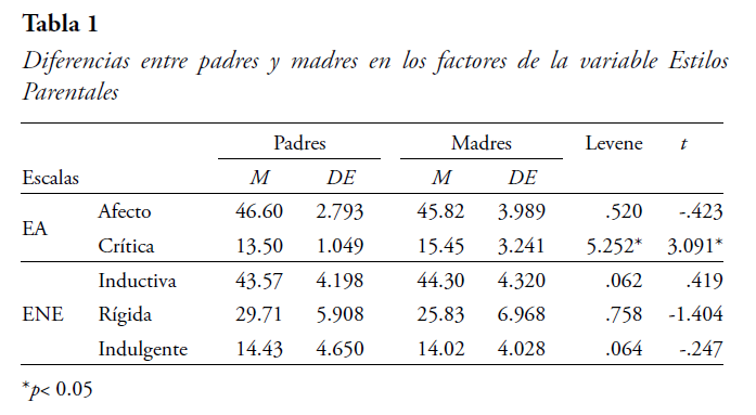 Para analizar si los padres y las madres tienen una percepción diferente en cada uno de los factores de la variable Estilos Parentales, se utilizó la prueba t de Student, como se presentan los datos descriptivos y la comparación de medias en la Tabla 1.