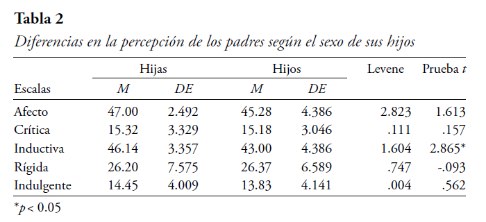 En cuanto a la percepción de padres y madres, según sean sus hijos varones o mujeres, se encuentran diferencias estadísticamente significativas en la percepción de los padres según sean los hijos de sexo masculino o femenino, únicamente en la subescala Inductiva, con un p = 0.006, como se observa en la Tabla 2.