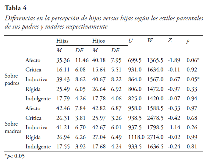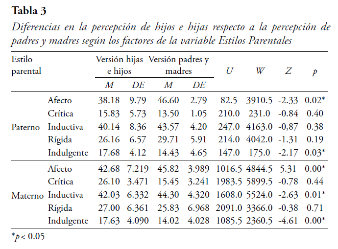 Al comparar la percepción de hijos e hijas con respecto a la percepción de padres y madres, se encuentra diferencias entre la percepción de los hijos e hijas con respecto a la de los padres, para las escalas de Afecto e Indulgente. También se observan diferencias significativas en la percepción de hijos e hijas respecto a las madres en las escalas de Afecto, Inductiva e Indulgente, como se observa en la Tabla 3.