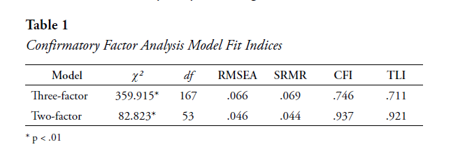 For confirmatory factor analyses, Mplus Version 6.12 was used. For all other analyses, IBM SPSS version 22 was used. Theoretical fit indices were considered to interpret the model fit of the CFA approach. A model fit was considered acceptable if RMSEA < .07, SRMR < .08, and CFI and TLI > .90 (Hooper, Coughlan, & Mullen, 2008). Additionally, an alternative model (AM) approach to CFA (Byrne, 2012) was used, allowing for the testing of alternative models based on previous studies. In this case, the compared models were a three-factor model versus a two-factor model.