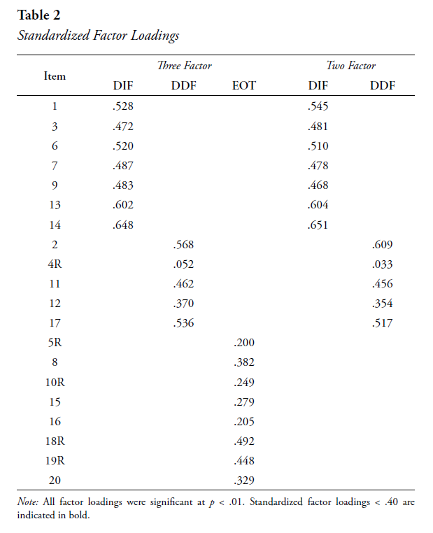 As shown in Table 1, the two-factor solution (including only DIF and DDF subscales) had a very good fit with the data, while estimates for the three-factor CFA showed an unacceptable model fit. Items 4 and 12 had factor loadings lower than the .4 cutoff point (Stevens, 1992). Standardized factor loadings for both models are shown in Table 2.